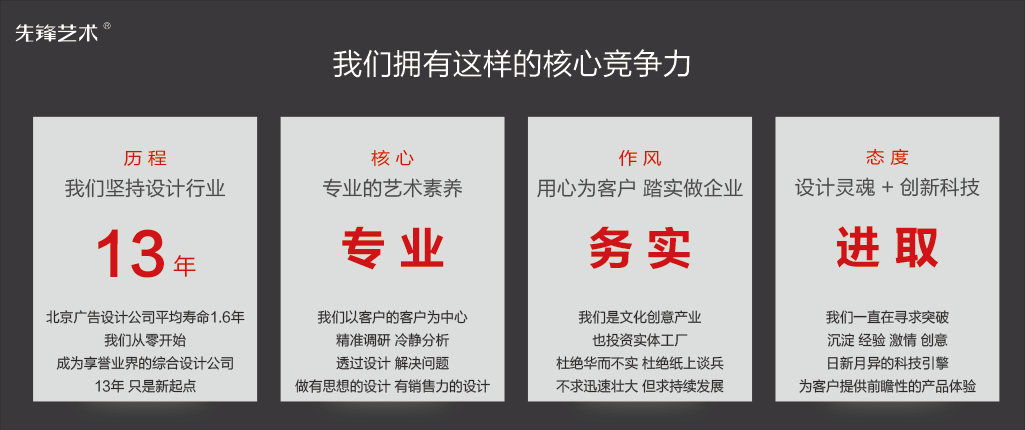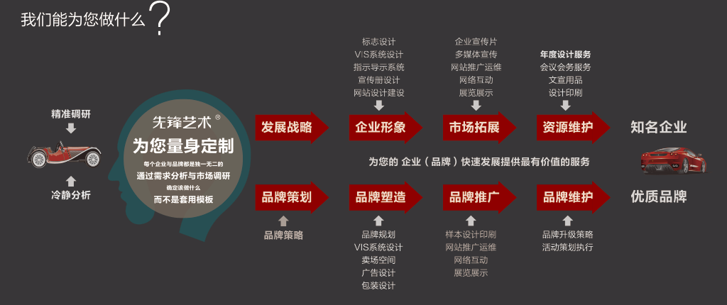 我們協(xié)助企業(yè)提升企業(yè)形象、優(yōu)化產(chǎn)品風(fēng)格、洞悉市場(chǎng)機(jī)遇、發(fā)展品牌資產(chǎn)、成就客戶(hù)價(jià)值;杜絕華而不實(shí),杜絕紙上談兵 !