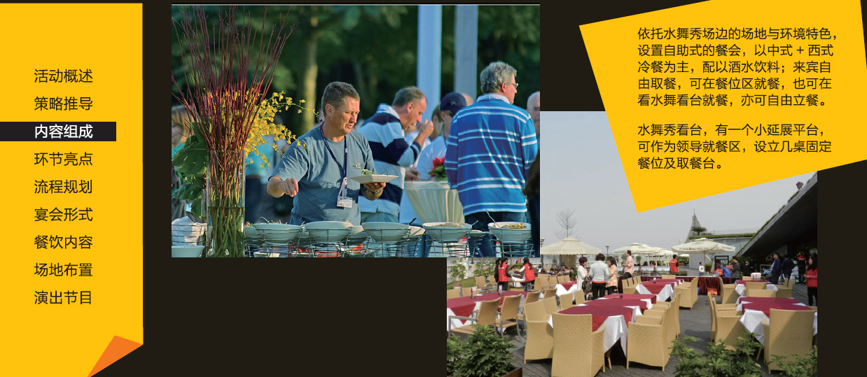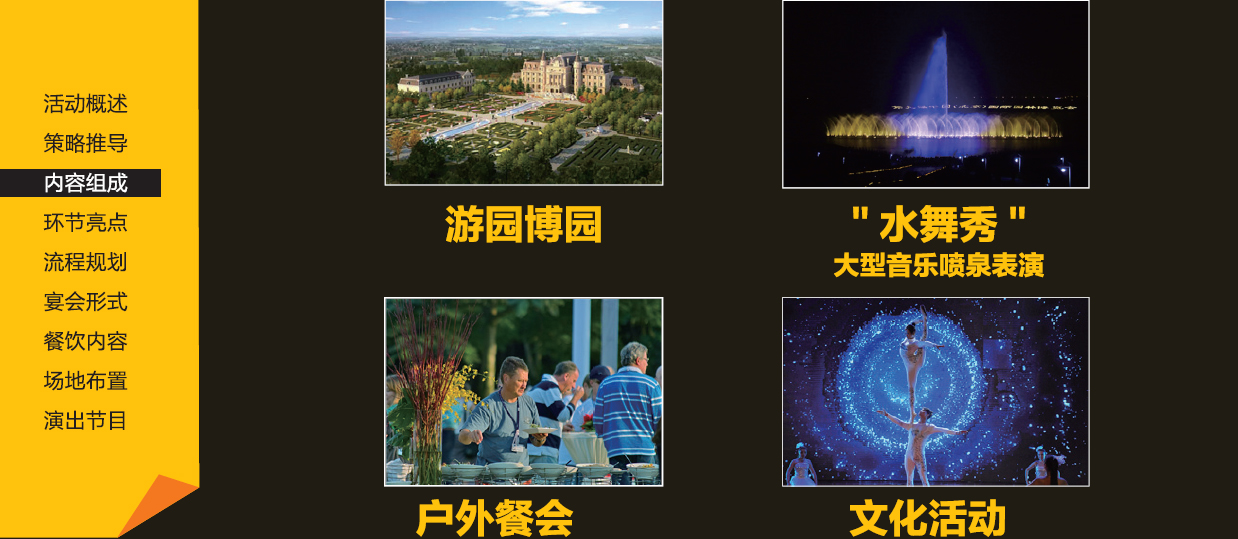 活動內容:園博園游園 + 戶外冷餐 + 音樂噴泉秀 + 晚會 + 晚宴